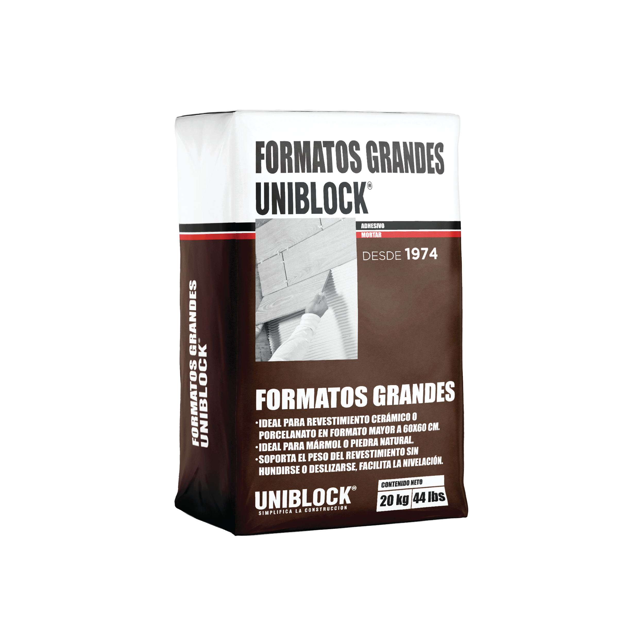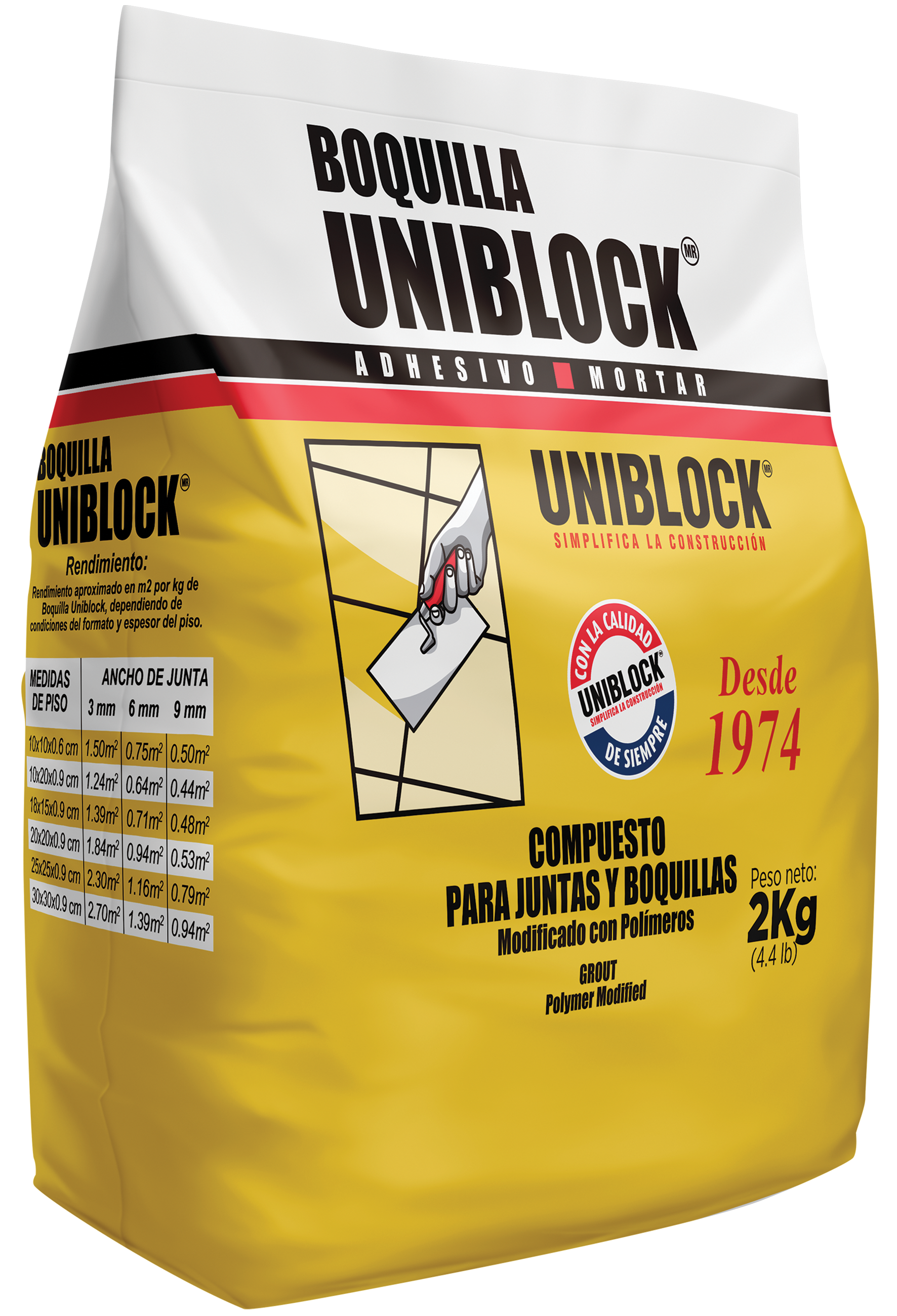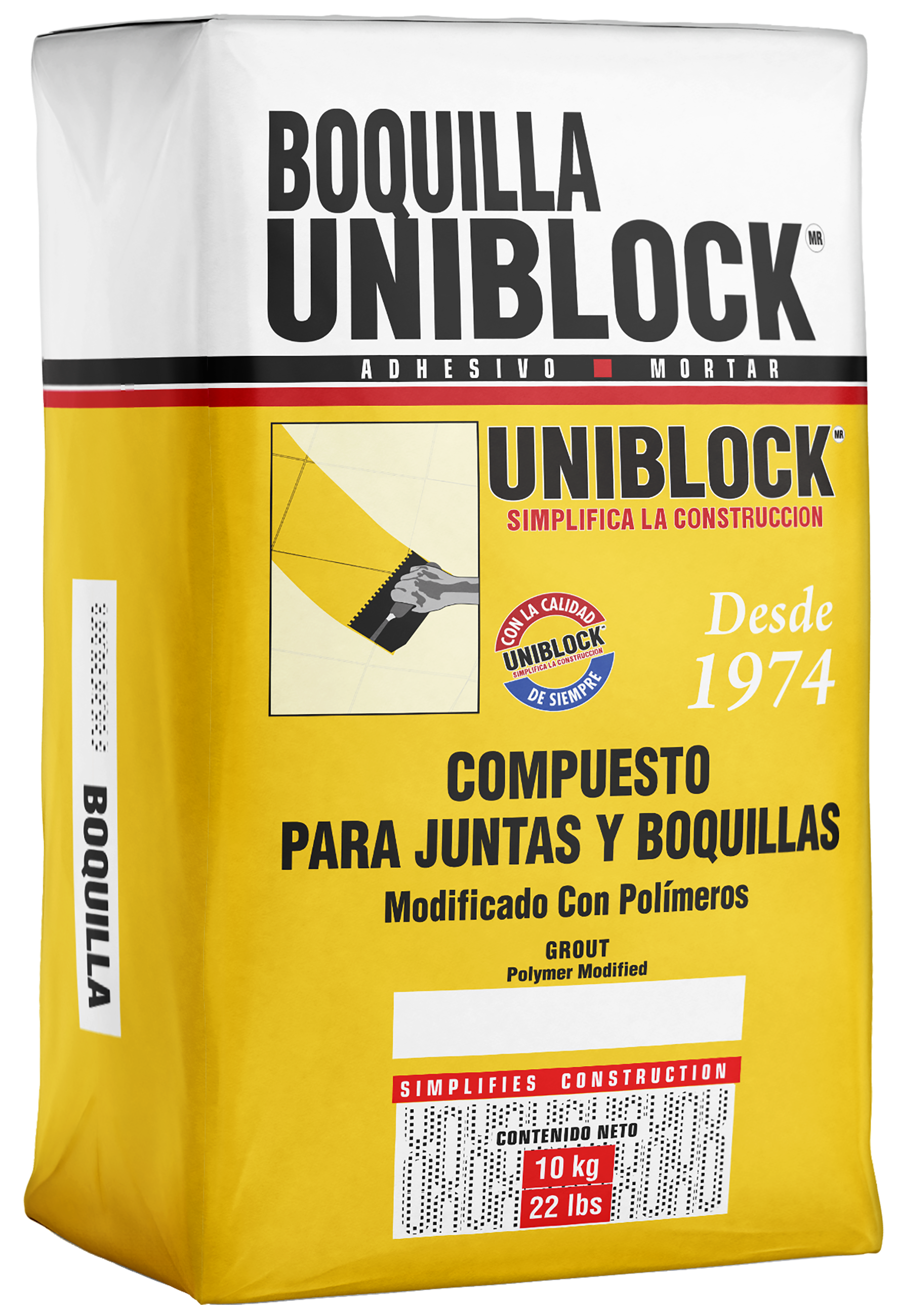 BOQUILLA UNIBLOCK es una mezcla elaborada con cemento Portland, arena de granulometría controlada y aditivos químicos. Diseñado para rellenar los espacios entre las piezas del recubrimiento cerámico para juntas con ancho de 3 a 5 mm sin arena y de 3 a 15 mm con arena.