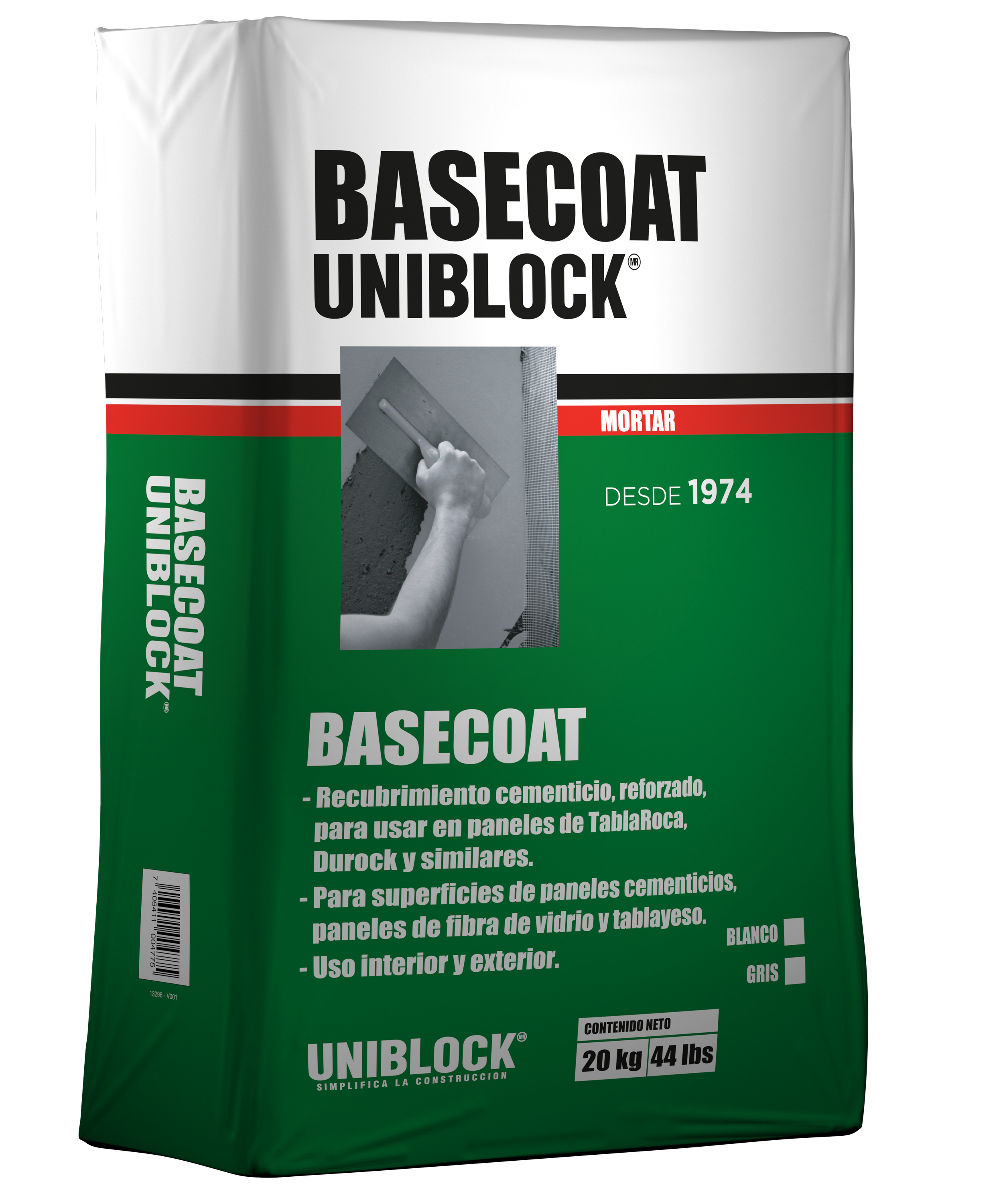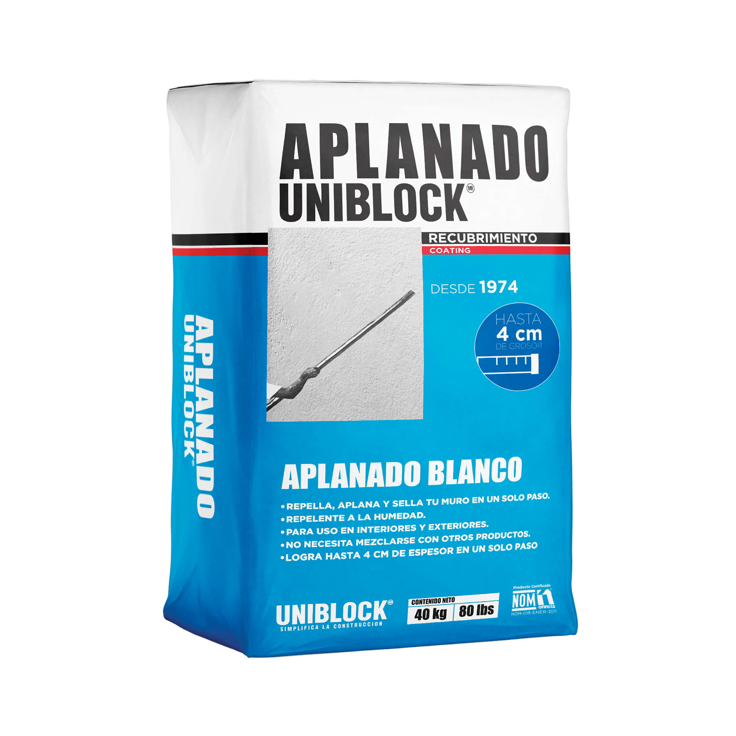 APLANADO UNIBLOCK es una mezcla de cemento Portland, pigmentos especiales, refuerzos polimerizados, aditivos para el fraguado y agregados con granulometría controlada.